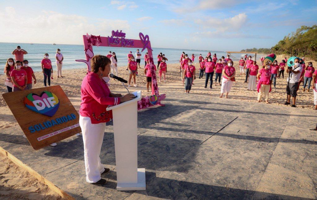 “La detección temprana con vistas a superar el pronóstico y la supervivencia sigue siendo la piedra angular del control del cáncer de mama. Ese es el objetivo de los que estamos aquí: concientizar acerca de la detección temprana. ¡Vamos a cuidarnos!”, enfatizó la Presidenta municipal, después de realizar el Lazo Solidario en la playa 88, una de las tres que cuenta con certificación Blue Flag.