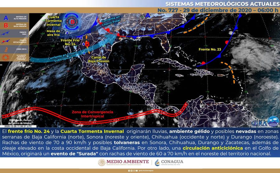A su vez, la Cuarta Tormenta Invernal se ubicará sobre el norte del país e interaccionará con la corriente en chorro polar, provocando ambiente gélido en zonas serranas de la Mesa del Norte, rachas de viento de 80 a 90 km/h con posibles tolvaneras en Durango, Zacatecas y Aguascalientes, además de caída de nieve y/o aguanieve principalmente en las sierras de Sonora, Chihuahua, Coahuila, Durango, Nuevo León, Zacatecas y San Luis Potosí.