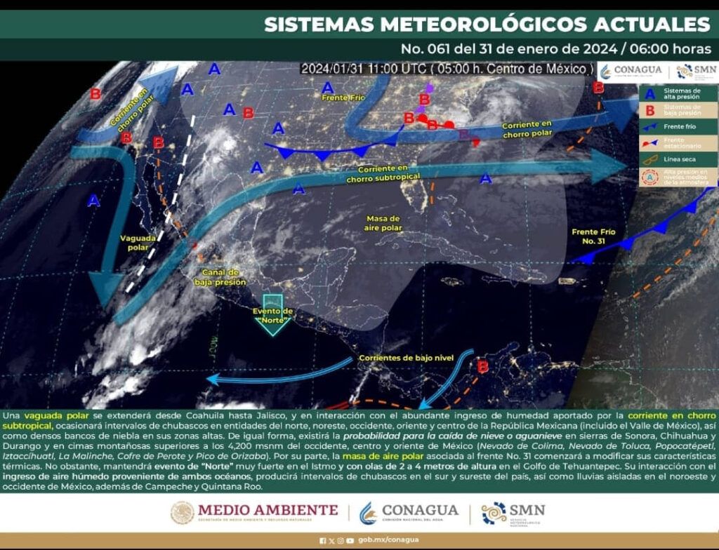 Cielo medio nublado a nublado la mayor parte del día. Por la mañana, ambiente templado a fresco, siendo frío con posibles heladas y bancos de niebla en zonas serranas de Tamaulipas y muy frío en zonas montañosas de Veracruz. Por la tarde, ambiente templado cálido. Probabilidad de intervalos de chubascos en la región. Probabilidad para la caída de nieve o aguanieve en cimas montañosas superiores a los 4,200 msnm de Veracruz (Cofre de Perote y Pico de Orizaba). Viento del este de 10 a 20 km/h con rachas de 25 a 30 km/h.