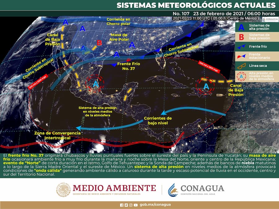Este día, el frente No. 37 se extenderá sobre el sureste del país y la Península de Yucatán, originando chubascos y lluvias puntuales fuertes en dichas regiones; su masa de aire frío ocasionará ambiente frío a muy frío durante la mañana y noche sobre la Mesa del Norte, oriente y centro de la República Mexicana; evento de “Norte” de corta duración en el Istmo, Golfo de Tehuantepec y la Sonda de Campeche; además de bancos de niebla matutinos a lo largo de la Sierra Madre Oriental y el sureste de México.