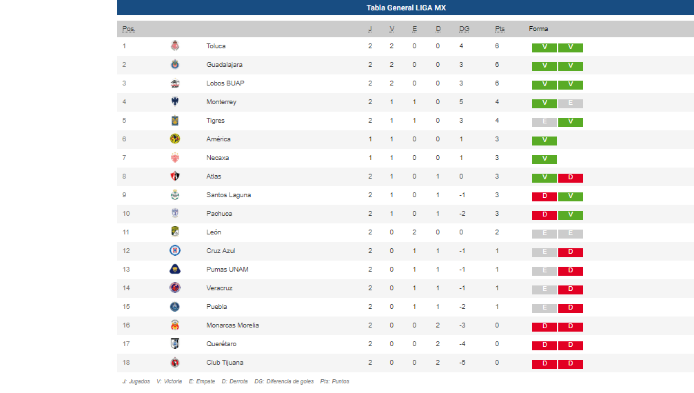 Más abajo, en el lugar cuatro y cinco, se ubican los equipos regiomontanos, ambos con cuatro puntos. Los puestos de Liguilla los completan América, Necaxa y Atlas, todos con tres unidades. Cabe destacar que Águilas y Rayos tienen un partido menos, debido a que su duelo de la jornada 1 fue pospuesto.