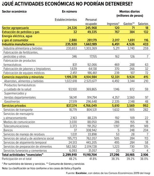 El ejercicio realizado por Excélsior asume que las actividades económicas privadas que se mantendrían operando, tal como ha sucedido en España e Italia, son las siguientes: el sector agropecuario; la extracción de petróleo y gas, las industrias manufactureras alimentaria, de fabricación de medicinas, de equipos médicos, y de aseo personal; el comercio mayorista y minorista de abarrotes, alimentos y bebidas; y los supermercados, tiendas departamentales y farmacias.
