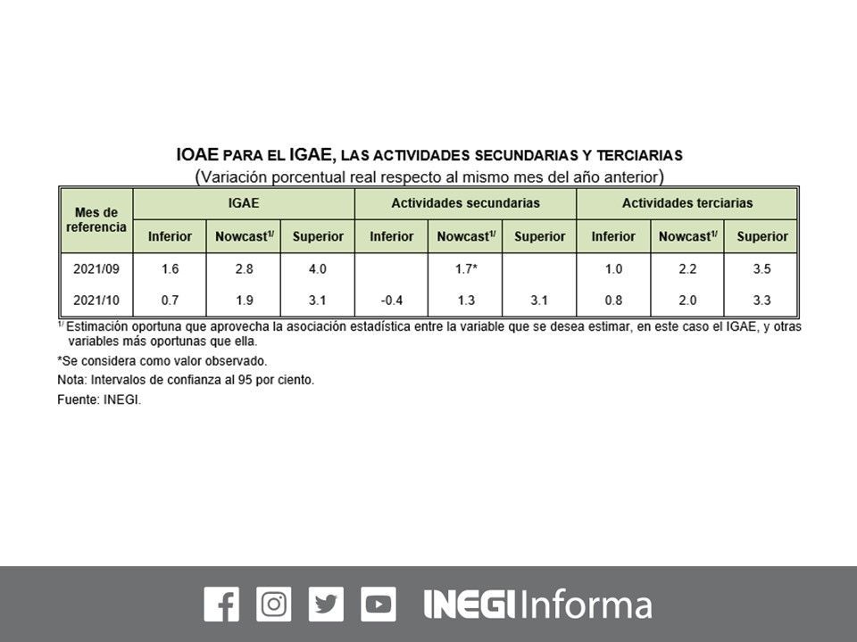 En relación con septiembre del 2021, el IOAE estima una variación de 0.6 por ciento para el IGAE en octubre de este año.