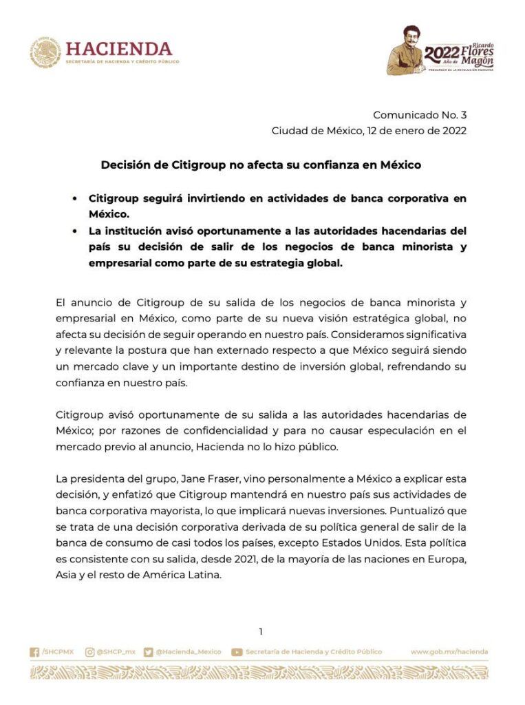 “Citigroup avisó oportunamente de su salida a las autoridades hacendarias de México; por razones de confidencialidad y para no causar especulación en el mercado previo al anuncio, Hacienda no lo hizo público”, informó.
