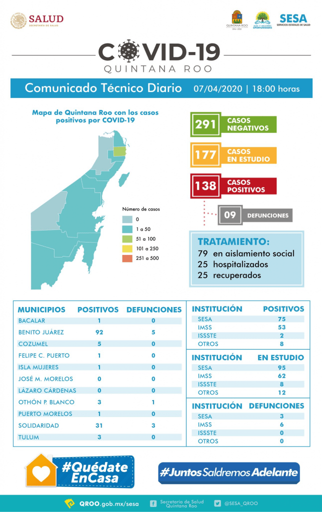 Hasta las 18 horas del 07 de abril, se han notificado 291 casos negativos, 177 en estudio, 138 positivos, 9 defunciones y 25 personas recuperadas a COVID-19.