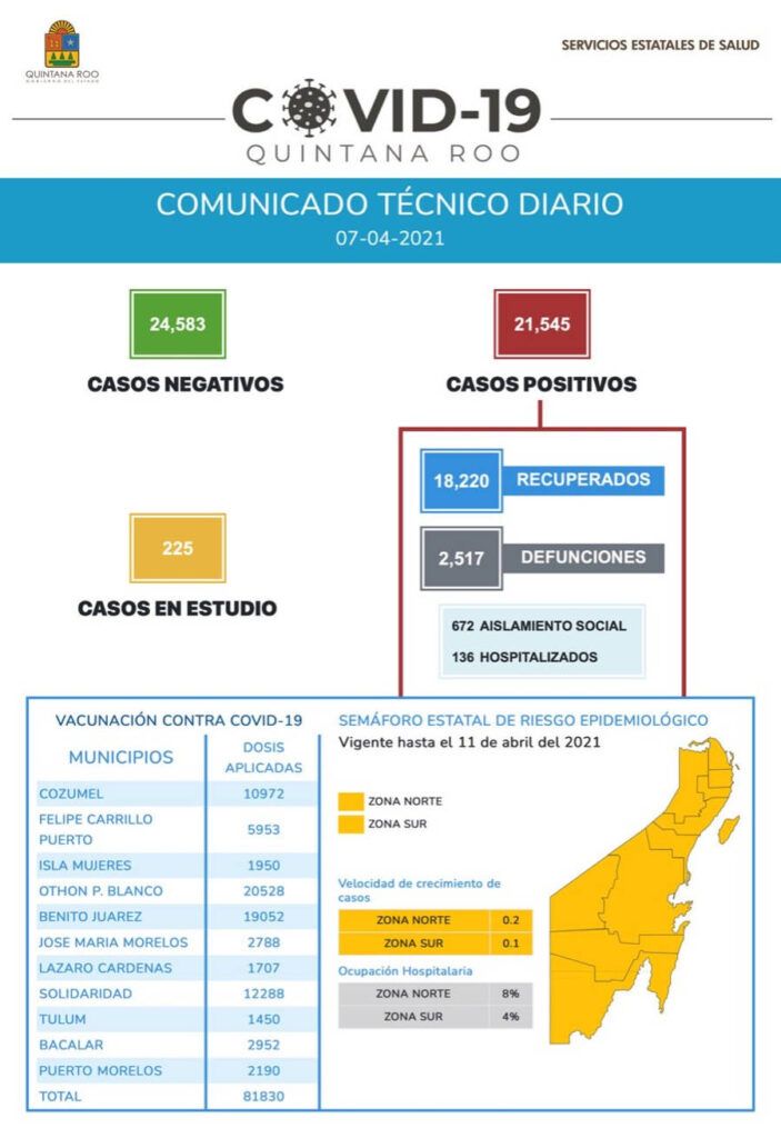 Hasta el 07 de abril, se han confirmado 21 mil 545 casos positivos y se han aplicado 81 mil 830 dosis de vacuna contra COVID-19.