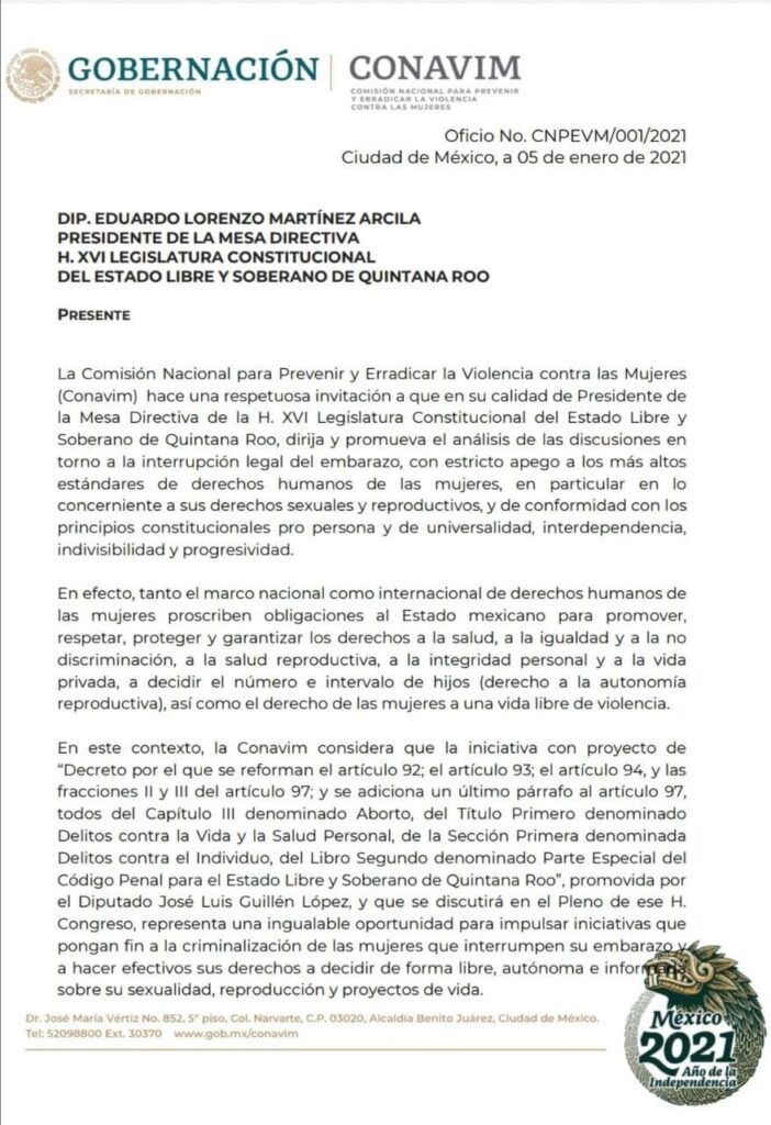 Dirigidos al Diputado Eduardo Lorenzo Martínez Arcila, presidente de la mesa directiva del Congreso del Estado, la Comisión Nacional para Prevenir y Erradicar la Violencia contra las Mujeres (Conavim) pide que se promueva el análisis de las discusiones en torno a la interrupción legal del embarazo con estricto apego y con los mas alto estándares de derechos humanos de las mujeres, en particular en lo referente a sus derechos sexuales y reproductivos.