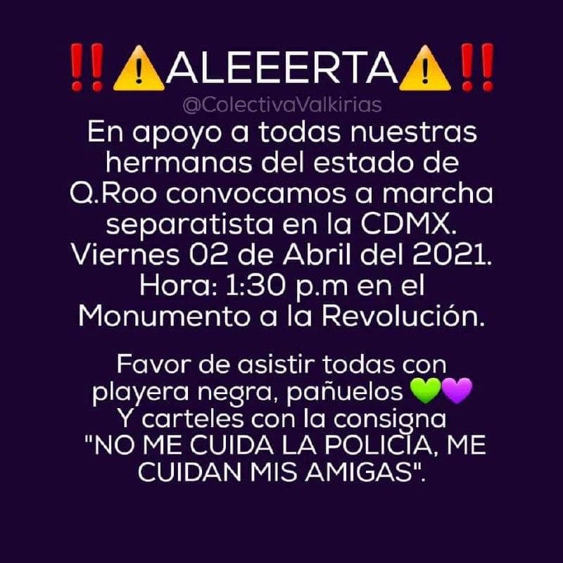 A manera de solidaridad, apoyo y para exigir justicia por las recientes muertes de mujeres en el estado de Quintana Roo, desde ayer, diversas colectivas a nivel nacional han convocado a una marcha separatista en la Ciudad de México.