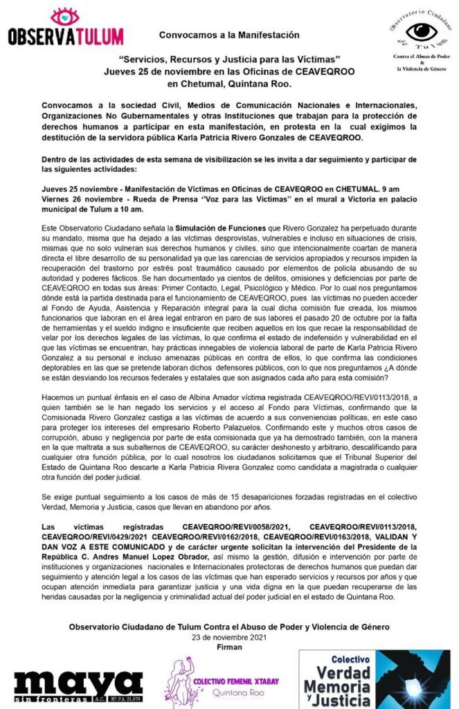 Diversas organizaciones invitan a la sociedad civil, victimas y comunidad en general a participar en esta manifestación colectiva donde las victimas que han sufrido las negligencias y simulación de funciones por parte de la Comisión Ejecutiva de Atención a Víctimas (CEAVEQROO) piden un alto a la impunidad y exigen Servicios, Recursos y Justicia para cada uno de los casos que se encuentran en abandono por parte de esta comisión.