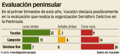 En contraste, según las estadísticas, de enero a marzo, de los 11 delitos a los que les da seguimiento por denuncias concretas, en la región, Yucatán está a la cabeza con 22 semáforos verdes, con resultados inferiores a la meta promedio nacional. Le siguen Campeche, con 13 círculos verdes, y al final Quintana Roo con siete.