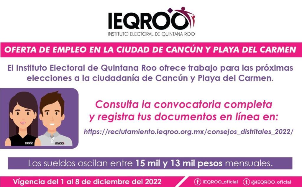 El Instituto Electoral de Quintana Roo ofrece trabajo para las próximas elecciones a la ciudadanía de Cancún y Playa del Carmen, por tal motivo quienes estén interesados deberán registrar sus documentos en línea durante el periodo del 1 al 8 de diciembre del año en curso, los sueldos que se ofertan oscilan entre 15 mil y 13 mil pesos mensuales.