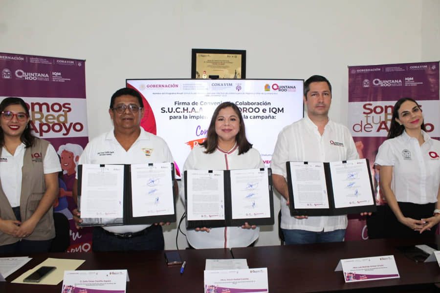 Chetumal, Quintana Roo; 12 de octubre de 2023.- Ponen en marcha la campaña “Conecta tu Red de Apoyo” para prevenir la violencia de género. IQM, IMOVEQROO y SUCHAA firman un convenio de colaboración para la implementación de la campaña