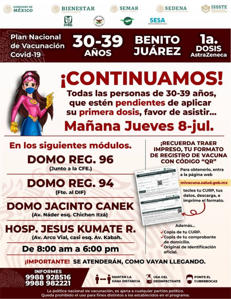 Este jueves 8 de julio continúa la aplicación de la primera dosis de la vacuna AstraZeneca para las personas de 30 a 39 años en el municipio de Benito Juárez.