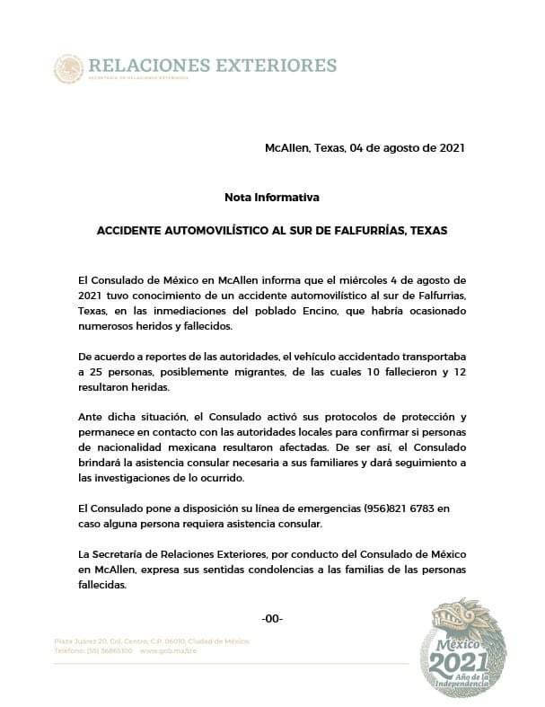El cónsul de México en McAllen, Texas, Froylán Yescas, aseguró que se identificó los cuerpos de los tres paisanos. Confirmó que el vehículo iba sobrecargado de personas y que el accidente no fue causado porque autoridades locales o federales lo persiguieran en la carretera.