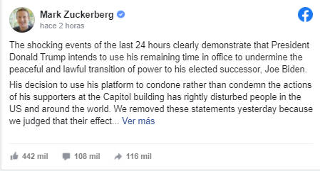 “En los últimos años, hemos permitido al presidente Trump usar nuestra plataforma consistente con nuestras propias reglas, a veces eliminando contenido o etiquetando sus publicaciones cuando violan nuestras políticas. Lo hicimos porque creemos que el público tiene derecho al acceso más amplio posible al discurso político, incluso al discurso controvertido. Pero el contexto actual es ahora fundamentalmente diferente, que implica el uso de nuestra plataforma para incitar a la insurrección violenta contra un gobierno democráticamente elegido. Creemos que los riesgos de permitir que el presidente continúe usando nuestro servicio durante este período son simplemente demasiado grandes. Por lo tanto extenderemos el bloqueo que hemos colocado en sus cuentas de Facebook e Instagram indefinidamente y durante al menos dos semanas hasta que se complete la transición pacífica del poder”.