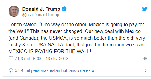 Después de que se aprobara el Tratado comercial entre México, Estados Unidos y Canadá, el mandatario estadounidense aseguró que con el ahorro que este nuevo acuerdo genera, México estará pagando el muro fronterizo.