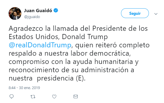 Guaidó confirmó la llamada en un tuit, en el que señala que Trump expresó su “completo respaldo” a su “labor democrática” y “compromiso con la ayuda humanitaria” para Venezuela.