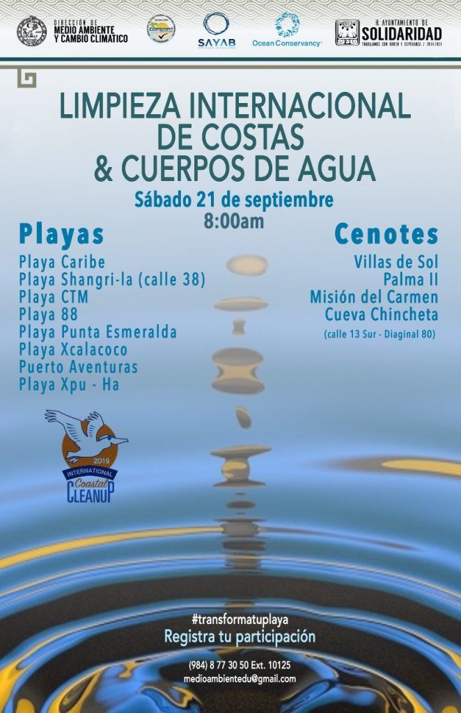 El municipio de Solidaridad invita a la Limpieza Internacional de Costas y Cuerpos de Agua que se llevará a cabo el sábado 21 de septiembre a las 8:00 am.