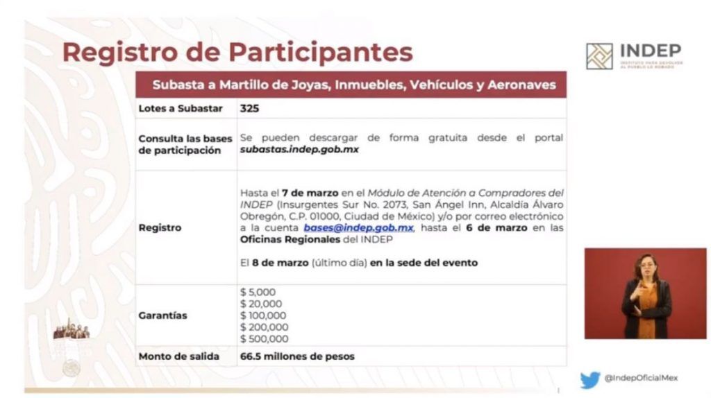 El funcionario federal informó que se subastarán 325 lotes entre los que destacan inmuebles, vehículos de lujo, joyas, vehículos y automóviles chatarra y aeronaves chatarra.