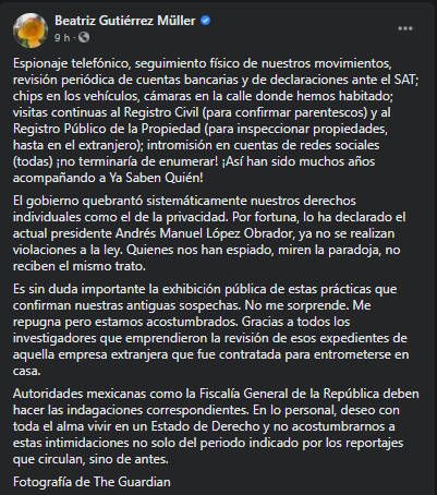 La esposa del presidente Andrés Manuel López Obrador, Beatriz Gutiérrez, publicó en su cuenta de Instagram, un texto de crítica al espionaje de ella, los hijos del mandatario y el entorno cercano a éste: