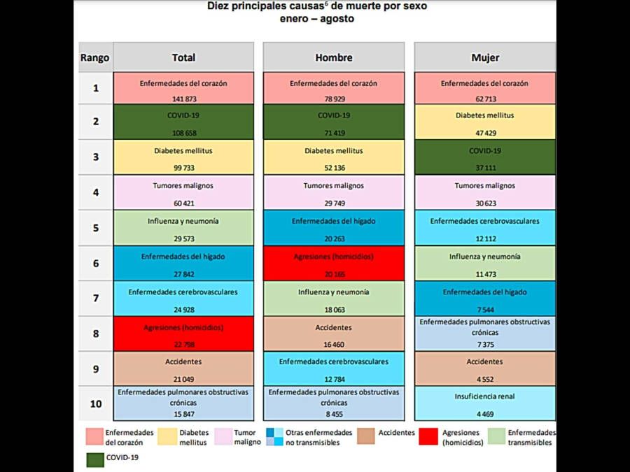Las causas donde se observan los mayores excesos de mortalidad en número de casos fueron las enfermedades del corazón, la diabetes mellitus y la influenza y neumonía. En estas últimas se esperaban 20 mil 297 muertes y ocurrieron 29 mil 228 defunciones, un “exceso de mortalidad” de 44 por ciento, explicó el organismo.