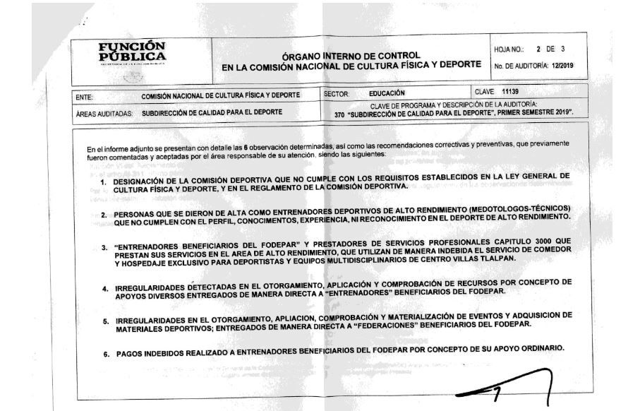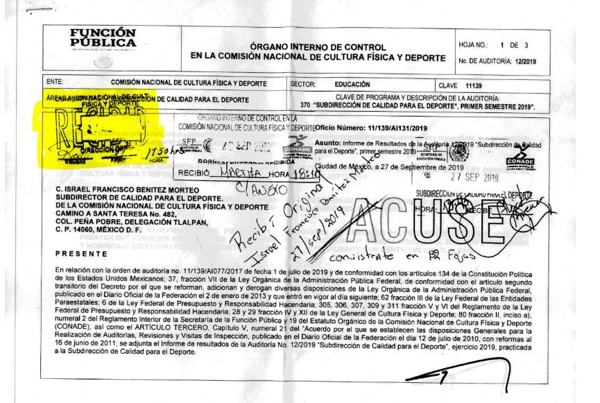 Así lo demuestra el resultado de la auditoría que realizó el OIC (oficio número 11/139/AI131/2019) y que tiene el sello de recibido de la dirección general de la Conade, así como de la subdirección de Calidad para el Deporte que encabeza Israel Benítez, uno de los funcionarios involucrados en el mecanismo de corrupción para malversar el dinero del Fondo para el Deporte de Alto Rendimiento (Fodepar).