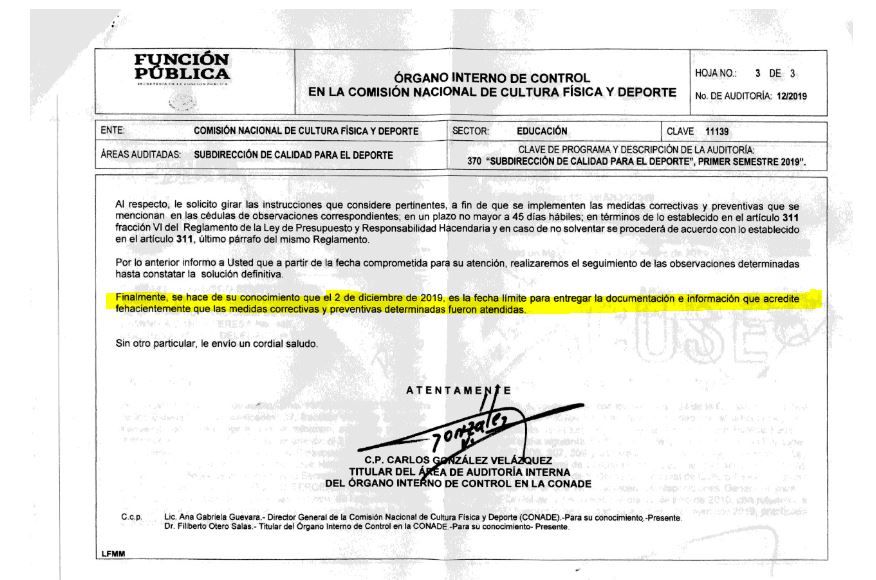 Ahí, el titular de Auditoría Interna del OIC de la Conade, Carlos González Velázquez, informó a Benítez sobre las irregularidades encontradas y le avisó que, con base en el Reglamento de la Ley de Presupuesto y Responsabilidad Hacendaria, los funcionarios contaban con hasta 45 días hábiles para solventar las observaciones.