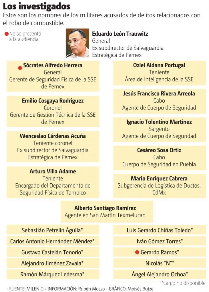 De los 21 militares imputados, solo 19 se presentaron. Dos no fueron notificados debidamente: el general Sócrates Alfredo Herrera, ex gerente de Seguridad Física de la SSE, y Gerardo Ramos. Además de Trauwitz, la FGR señaló a cinco altos mandos: el teniente coronel Wenceslao Cárdenas Acuña, ex subdirector de Salvaguardia Estratégica; el coronel Emilio Cosgaya Rodríguez, ex gerente de gestión técnica de la SSE; el teniente Oziel Aldana Portugal, del área de Inteligencia de la SSE; el teniente Arturo Villa Adame, ex encargado del Departamento de Seguridad Física de Tampico, y el general Sócrates.