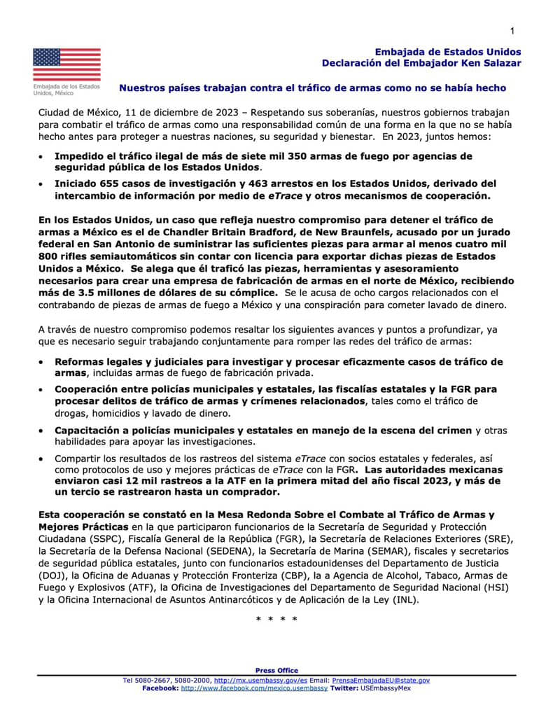 El embajador también detalló que se hay 655 casos de investigación y 463 casos de arresto en territorio estadounidense, derivado del intercambio de información por medio del software de rastreo, eTrace, y otros mecanismos de cooperación.