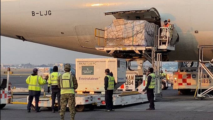 La mañana de este jueves, arribó al Aeropuerto Internacional de Ciudad de México (AICM) sustancia activa para 730 mil dosis de CanSino, que se envasarán en la planta de Drugmex, en Querétaro.