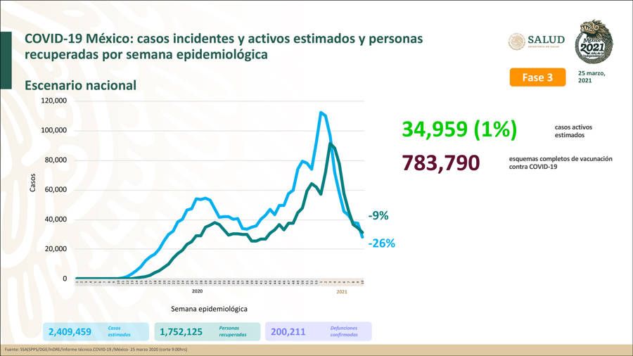 El número de casos estimados es de 2 millones 409 mil 459, y 34 mil 959 casos activos.