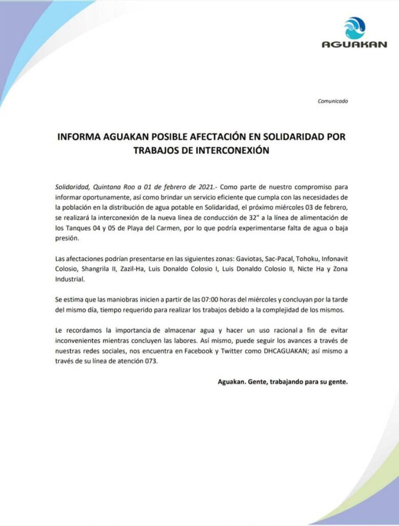 La concesionaria de agua potable Aguakan informó mediante comunicado de prensa que el miércoles 03 de febrero suspenderá suministro de agua en algunas colonias de Solidaridad por mantenimiento.