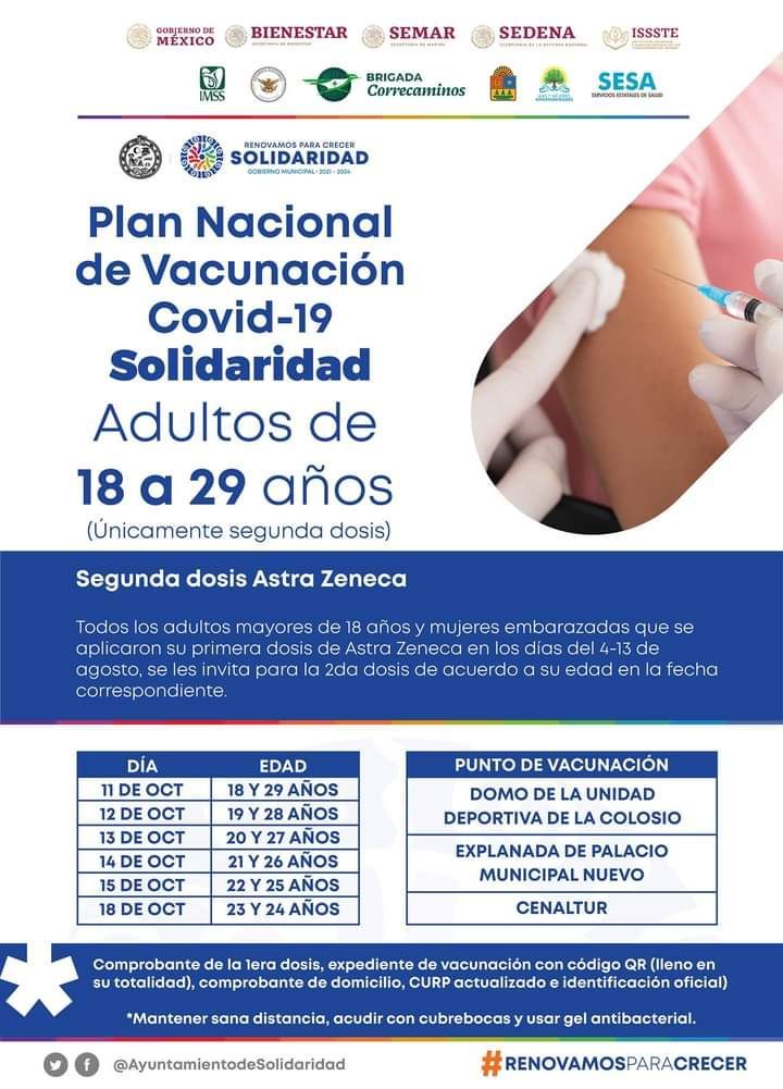Los puntos de vacunación serán el domo de la Unidad Deportiva “Luis Donaldo Colosio”, la explanada del nuevo Palacio Municipal y Cenaltur; para asistir a dichos módulos es indispensable asistir con el certificado de la primera dosis, expediente de vacunación con código QR (lleno en su totalidad), comprobante de domicilio, CURP actualizado e identificación oficial.