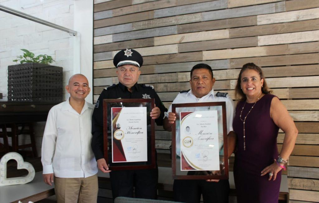 “Este reconocimiento representa la labor de todos los elementos que día a día dan muestra de su compromiso para brindar seguridad a los turistas y solidarenses”, señaló el director general de Seguridad Pública y Tránsito, Martín Estrada Sánchez, al recibir junto con el director de la Policía Turística, Alberto Pat Miss, una mención honorífica otorgada por el Centro Universitario Inglés.