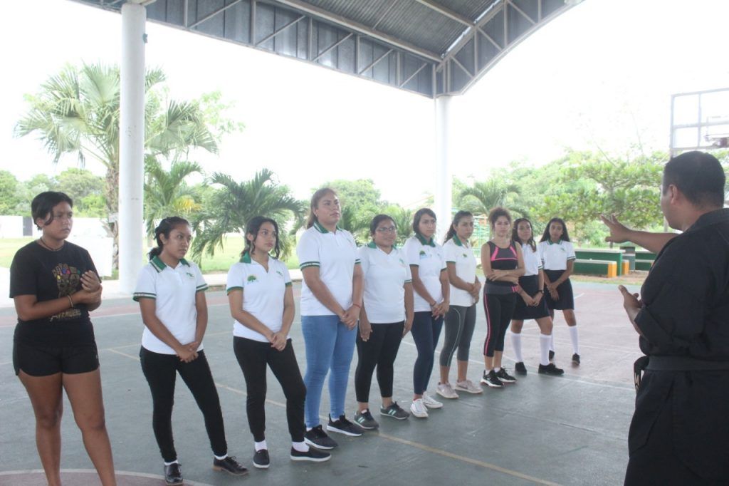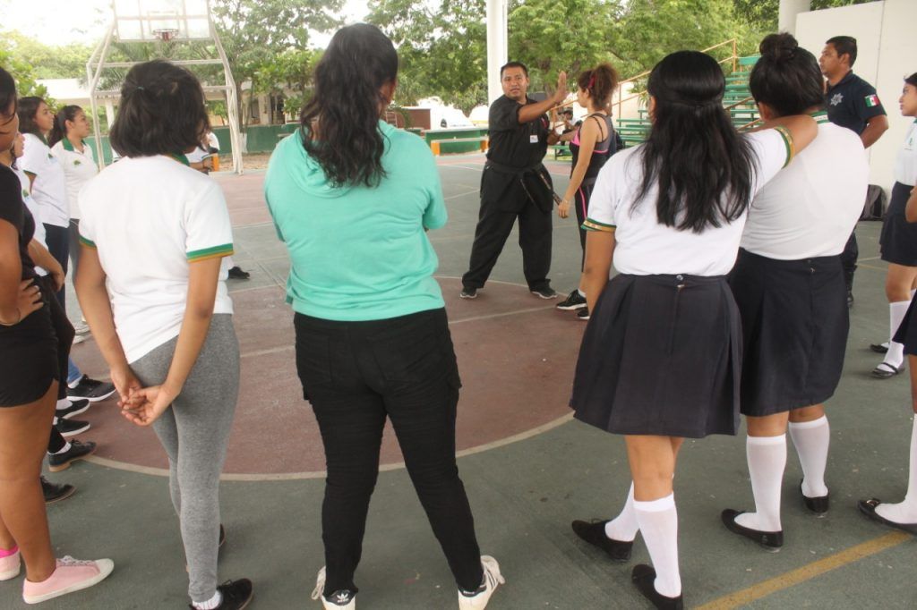 Alumnas del plantel Colegio de Estudios Científicos y Tecnológicos (CECyTE) de Playa del Carmen, recibieron clases de defensa personal por parte de instructores certificados de la Dirección General de Seguridad Pública y Tránsito Municipal, que dirige el encargado del despacho, el comandante Jorge Robles Aguilar, con el objetivo de reducir la vulnerabilidad de las jóvenes e informarles sobre los tipos y niveles de violencia a los que pudieran estar expuestos y qué hacer para prevenirlos.