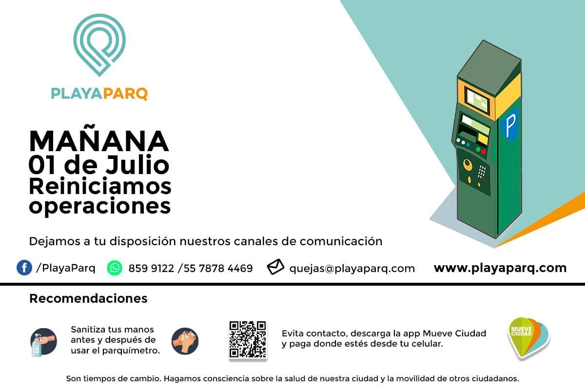 PlayaParq informó que a partir de este miércoles 1 de julio se reactivarán los parquímetros en Playa del Carmen, para mayores informes pueden visitar su página de Facebook www.playaparq.com.mx, o escribir a su correo electrónico quejas@playaparq.com.mx