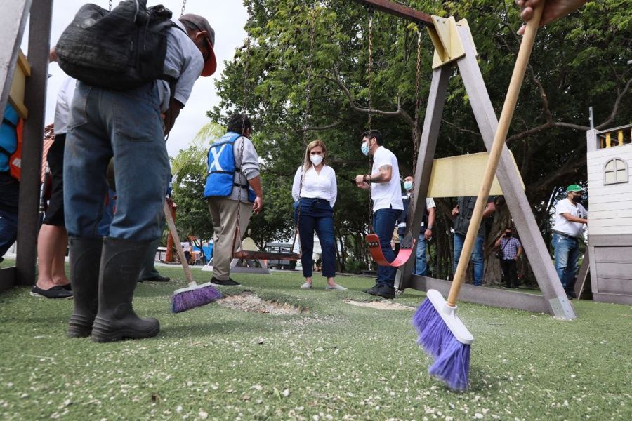 La alcaldesa testificó el severo deterioro que muestran las instalaciones del parque que se ubica sobre la avenida Palmas con circuito Avestruz, por abandono y falta de mantenimiento, tanto de áreas verdes como zonas de juegos infantiles y canchas deportivas, por lo que giró instrucciones para que se cambien y/o reparen los juegos infantiles, así también las instalaciones deportivas.
