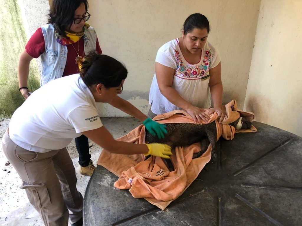 Después de horas de observación y cuidados por parte de los veterinarios, el jabalí fue puesto a resguardo en las instalaciones del Parque Xcaret.