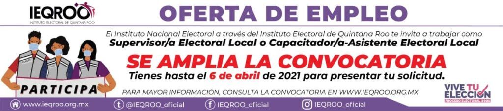 ¡No te quedes fuera! Intégrate al Proceso Electoral Local 2020-2021, tienes hasta el 29 de marzo para enviar tu documentación y ser seleccionado como Capacitador/a Asistente Electoral Local y/o Supervisor/a Electoral Local. El Instituto Electoral de Quintana Roo (IEQROO) te brinda la oportunidad de ocupar las 660 plazas que se encuentran disponibles en todo el Estado.