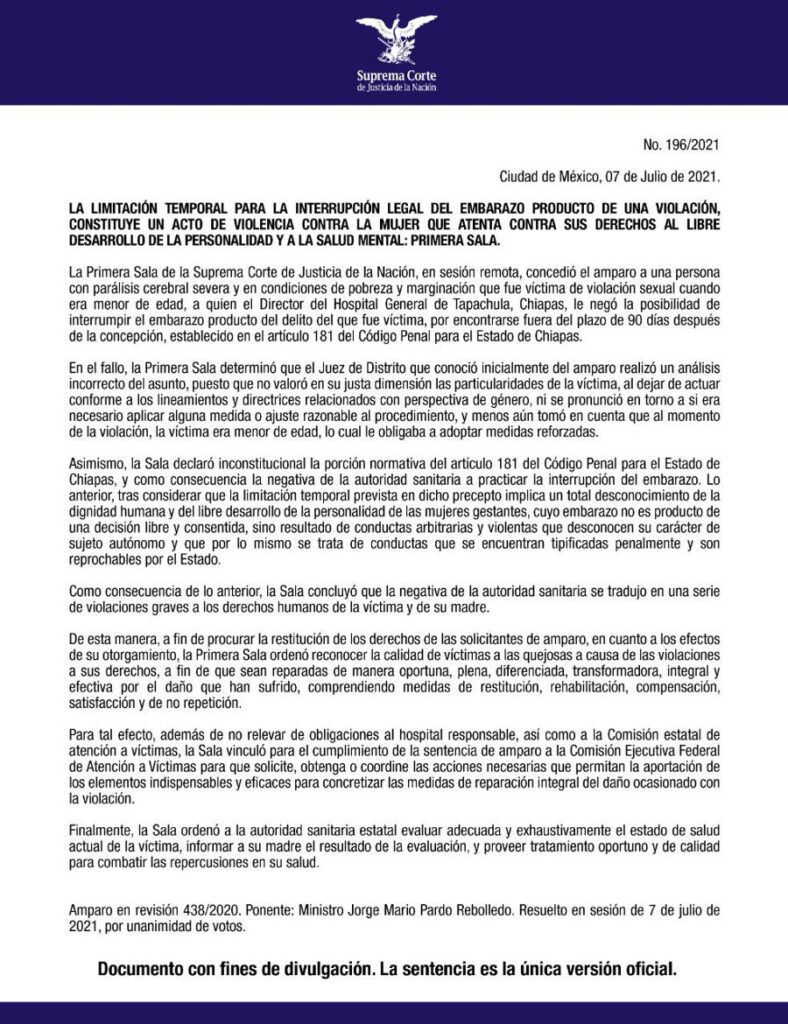 Este miércoles, el máximo tribunal del país, a propuesta del ministro Jorge Pardo Rebolledo, declaró inconstitucional la parte normativa del artículo 181 del Código Penal de Chiapas que impone un plazo de 90 días para poder interrumpir el embarazo sin que sea tipificado como delito.
