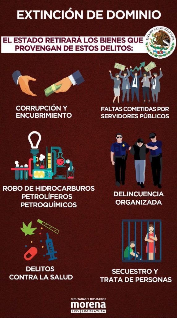 Con la modificación constitucional, se estipula que los delitos por actos de corrupción, hidrocarburos, petrolíferos, petroquímicos, recursos de procedencia ilícita como el lavado de dinero y la extorsión formarán parte del catálogo de delitos graves que ya existen, y el Estado podrá recuperar bienes derivados de actos de corrupción.