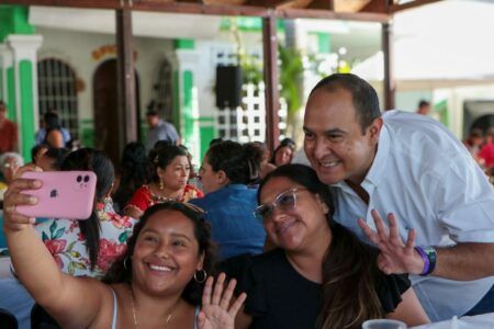 Este día Juan Carrillo habló de manera muy cercana con mujeres de Solidaridad, acompañado de Estefanía Mercado, candidata a la presidencia municipal de Solidaridad, y de Majo Osorio, candidata a la diputación local por el distrito 10, donde les agradeció su empeño y dedicación día a día para sacar a sus familias adelante, pero también porque han decidido apoyar al Partido Verde, a Morena y al PT, donde están los aliados del pueblo.