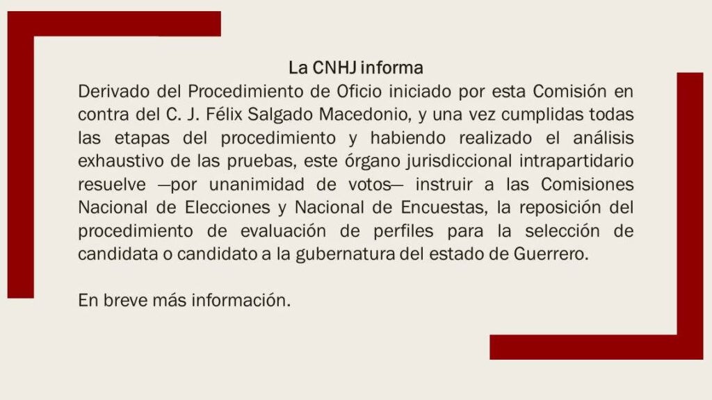 Por medio de sus redes sociales, la Comisión Nacional de Honestidad y Justicia de MORENA, emitió un comunicado donde informa que derivado del procedimiento iniciado en contra del C. J. Félix Salgado Macedonio, resuelve por unanimidad de votos la reposición del proceso de evaluación de candidata o candidato a la gubernatura de Guerrero.