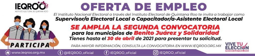 El Instituto Electoral de Quintana Roo pone a disposición de la ciudadanía de los municipios de Benito Juárez y Solidaridad plazas disponibles para trabajar durante el Proceso Electoral Local 2021, el sueldo que se oferta es de 9 mil pesos mensuales. El día de hoy se abrió el sistema para el registro y entrega de documentación, la fecha límite de registro vence el 30 de abril.