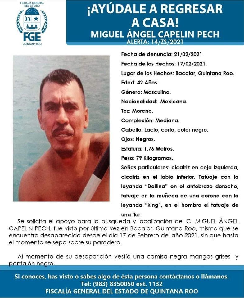 Se pide su ayuda para localizar a Miguel Ángel Capelín Pech de 42 años desaparecido el día 17 de febrero del año en curso en Bacalar Quintana Roo.