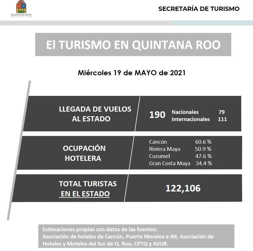 Datos estimados de Asociaciones de hoteles, del Consejo de Promoción Turística del Estado así como del ASUR que muestran el aterrizaje de 190 vuelos de los cuales 111 son de destinos internacionales y 79 de diferentes entidades de la República mexicana.