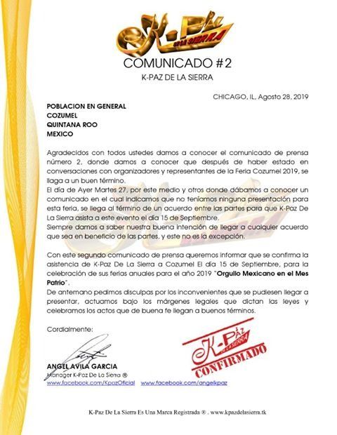Luego de que el grupo K-paz de la sierra negara su participación en la Feria de Cozumel 2019, y después de negociaciones con organizadores y representantes de la misma, lograron llegar a un acuerdo y confirmaron su asistencia el día 15 de septiembre como parte de la celebración de “Orgullo mexicano en el mes patrio”