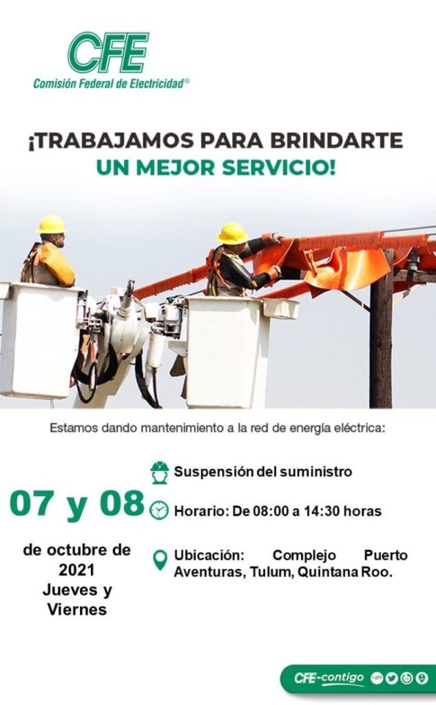 La Comisión Federal de Electricidad (CFE) informó a la ciudadanía que debido a servio de mantenmiento, habrá suspensión de energía eléctrica este vierne 8 de octubre en el complejo Puerto Aventuras, Tulum, Quintana Roo.