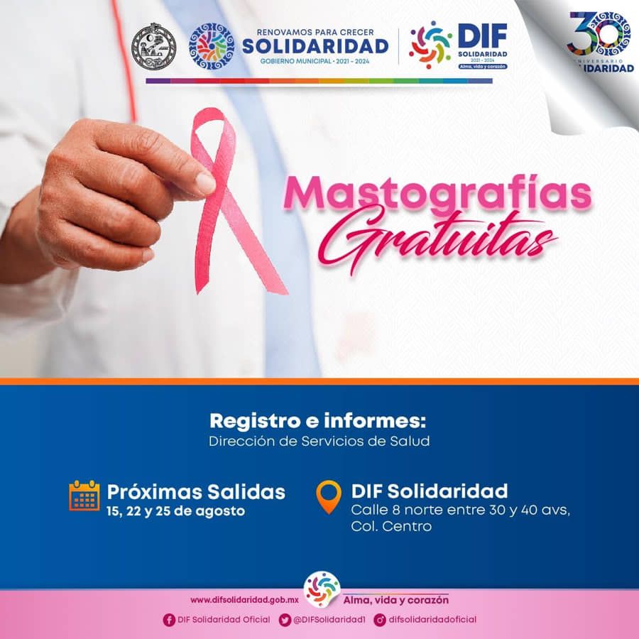 El sistema DIF en Solidaridad anunció que ofrecerá transporte gratuito para realizarse las mastografías gratuitas en Cancún durante agosto del 2023, esto previa cita en sus oficinas de la calle 8 norte entre avenidas 30 y 40 de Playa del Carmen.
