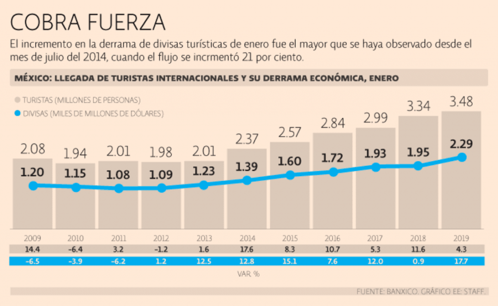 El Instituto Nacional de Estadística y Geografía (Inegi) reportó que, durante enero, México captó la histórica cifra de 2,288.9 millones de dólares por divisas turísticas, lo que representó un incremento de 17.7% respecto a igual mes del 2018, y se convirtió en el mayor salto para cualquier mes desde julio del 2014, cuando subió 21 por ciento.